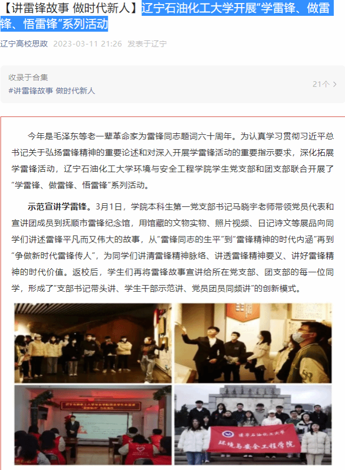 编者按:近日,辽宁高校思政微信公众号对我校环境与安全工程学院开展“学雷锋、做雷锋、悟雷锋”系列活动进行了宣传报道。现将相关报道转载如下: