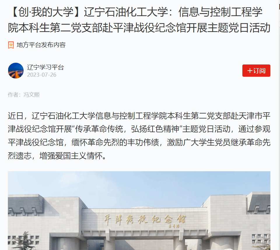 编者按:近日,学习强国辽宁学习平台对我校信息与控制工程学院本科生第二党支部赴天津市平津战役纪念馆开展“传承革命传统,弘扬红色精神”主题党日活动进行了宣传报道。现将相关报道转载如下: