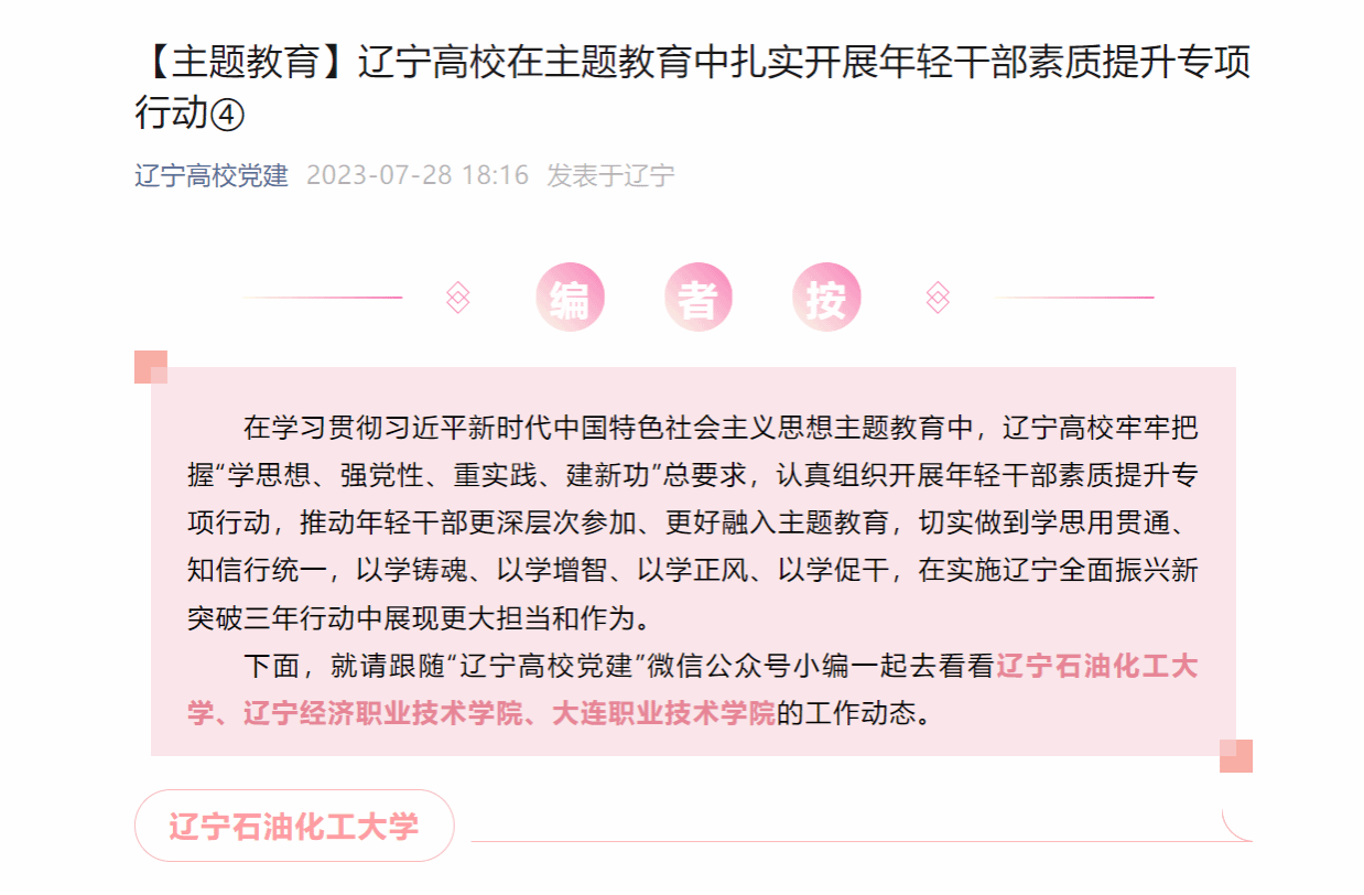 编者按:近日,辽宁高校党建微信公众号对辽宁高校牢牢把握“学思想、强党性、重实践、建新功”总要求,认真组织开展年轻干部素质提升专项行动,推动年轻干部更深层次参加、更好融入主题教育,切实做到学思用贯通、知信行统一,以学铸魂、以学增智、以学正风、以学促干,在实施辽宁全面振兴新突破三年行动中展现更大担当和作为进行了宣传,其中对我校召开年轻干部素质提升专项工作会议作了报道。现将相关报道转载如下:
