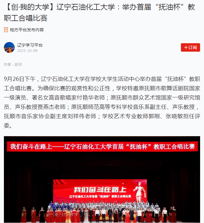 编者按:近日,学习强国辽宁学习平台、辽宁日报·辽望号对我校在学校大学生活动中心举办首届“抚油杯”教职工合唱比赛进行了宣传报道。现将相关报道转载如下: