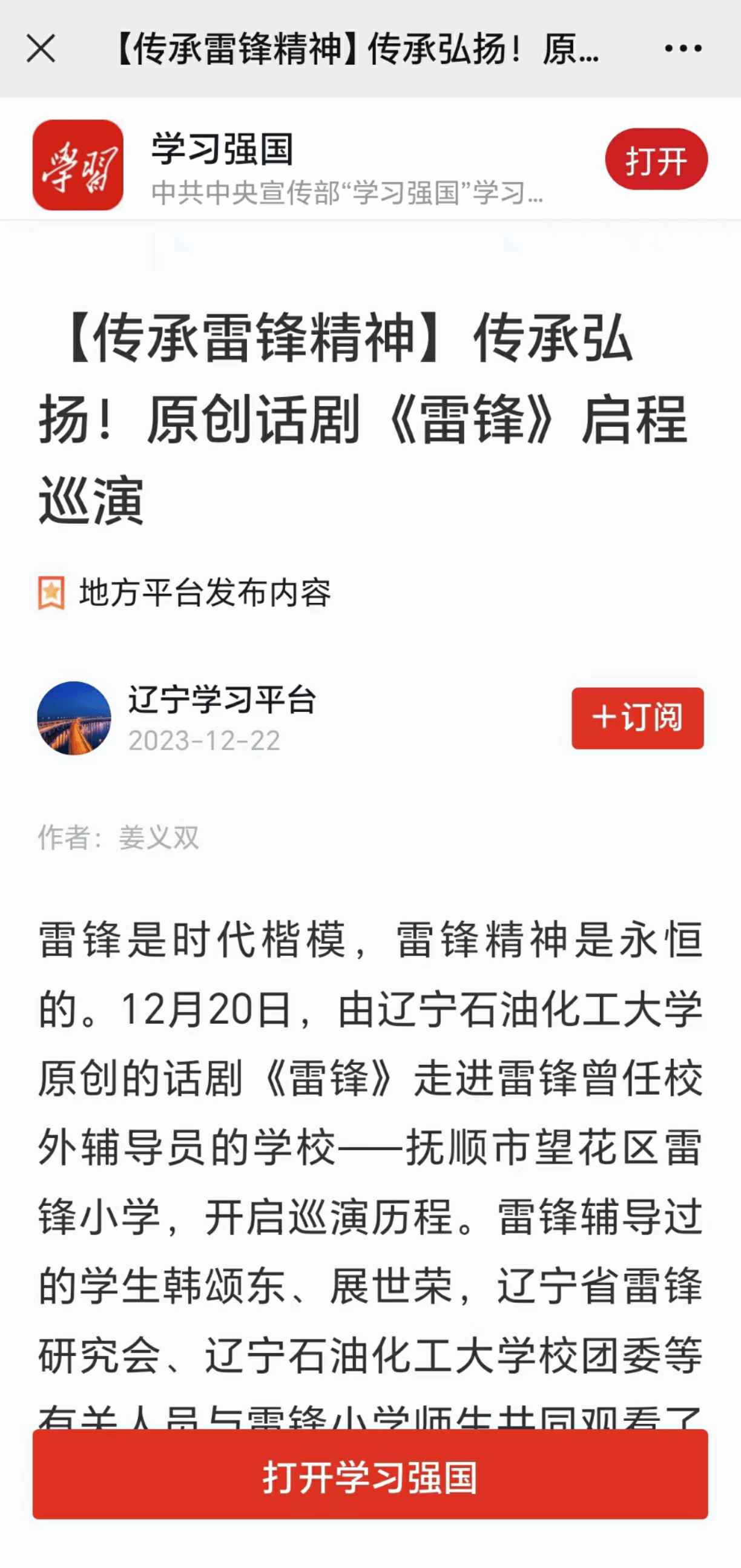 学习强国、辽望·辽宁日报、今日头条:传承弘扬!原创话剧《雷锋》启程巡演