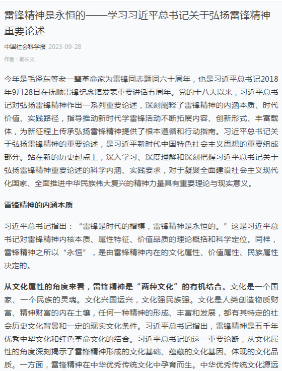 编者按:9月28日,学习强国主平台对我校党委书记郭长义撰写的文章《雷锋精神是永恒的——学习习近平总书记关于弘扬雷锋精神重要论述》进行了宣传报道,现将相关报道转载如下: