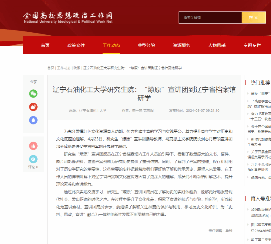 编者按:近日,全国高校思想政治工作网对我校研究生院研究生“燎原”宣讲团走进辽宁省档案馆研学进行了宣传报道。现将相关报道转载如下: