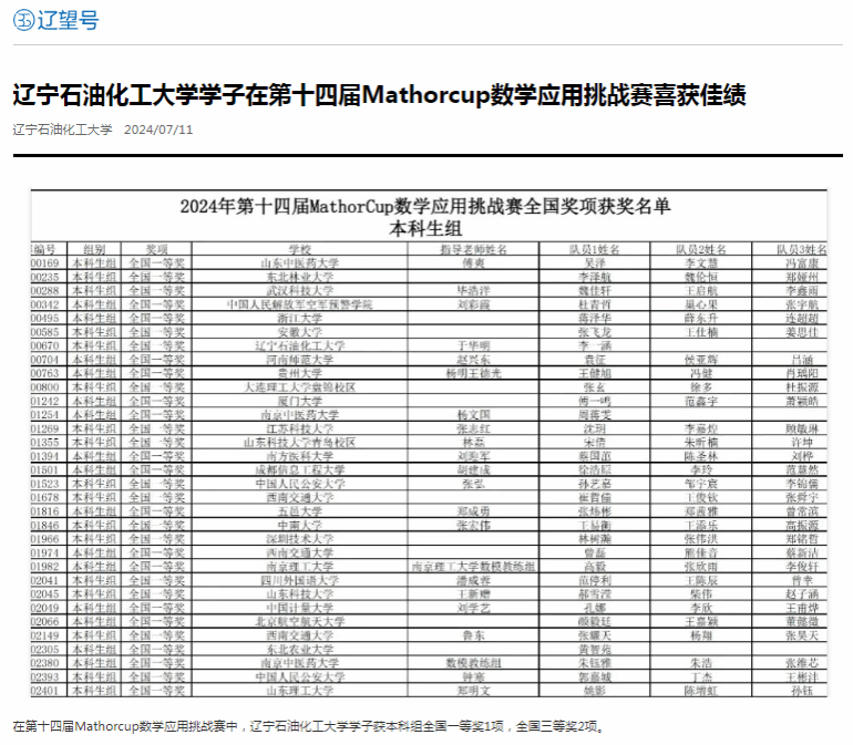 编者按:7月11日,辽宁日报·辽望号、人民日报客户端·人民号对我校学子在第十四届Mathorcup数学应用挑战赛喜获佳绩进行了宣传报道。现将相关报道转载如下: