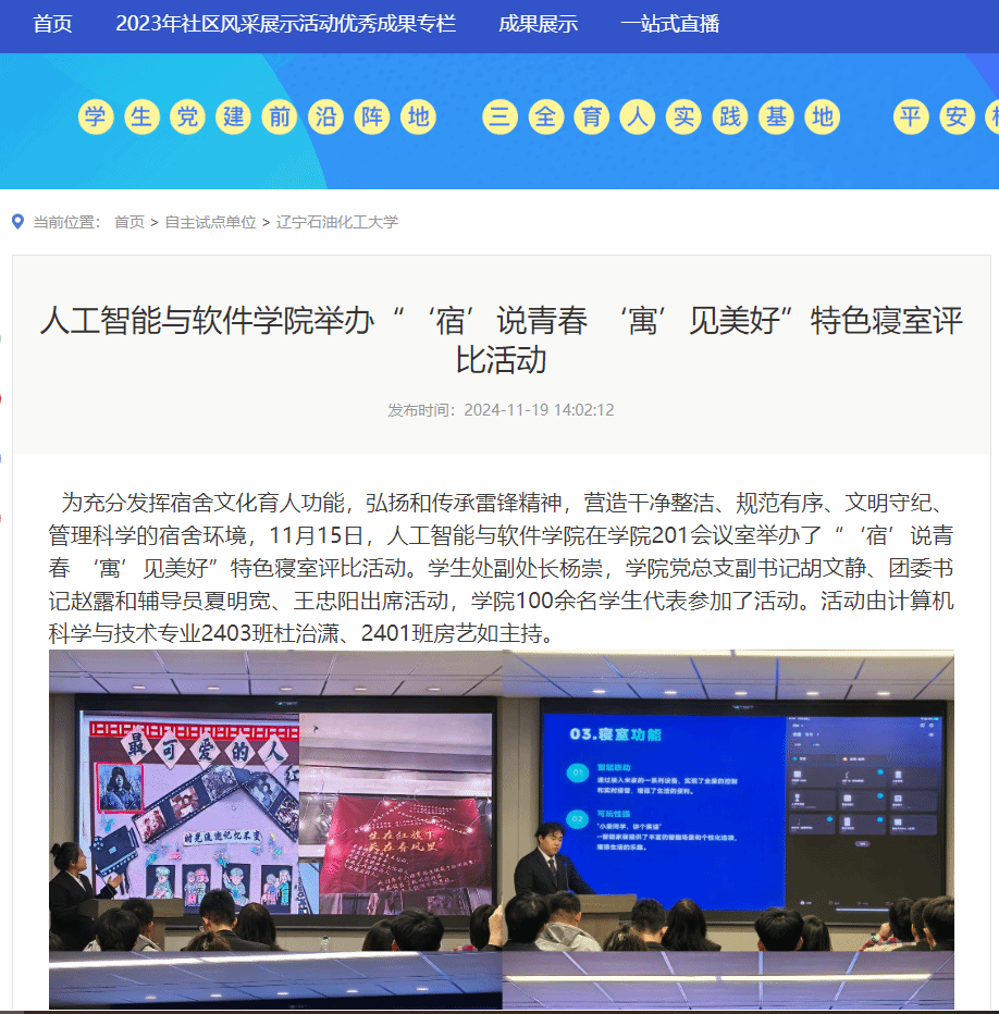 编者按:人工智能与软件学院特色寝室评比活动,丰富学生校园生活,推动思想政治教育进宿舍,有效发挥学生宿舍是学生管理主阵地、主渠道的作用。全国高校思想政治工作网、中国大学生网对此进行了宣传报道。现将相关报道转载如下: