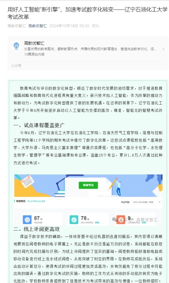 编者按:10月18日,高教优智汇微信公众号对我校教育考试与评价的数字化转型,顺应了数字时代发展的迫切需求,对推进教育强国战略和教育现代化进程具有重大意义进行了宣传报道。现将相关报道转载如下:
